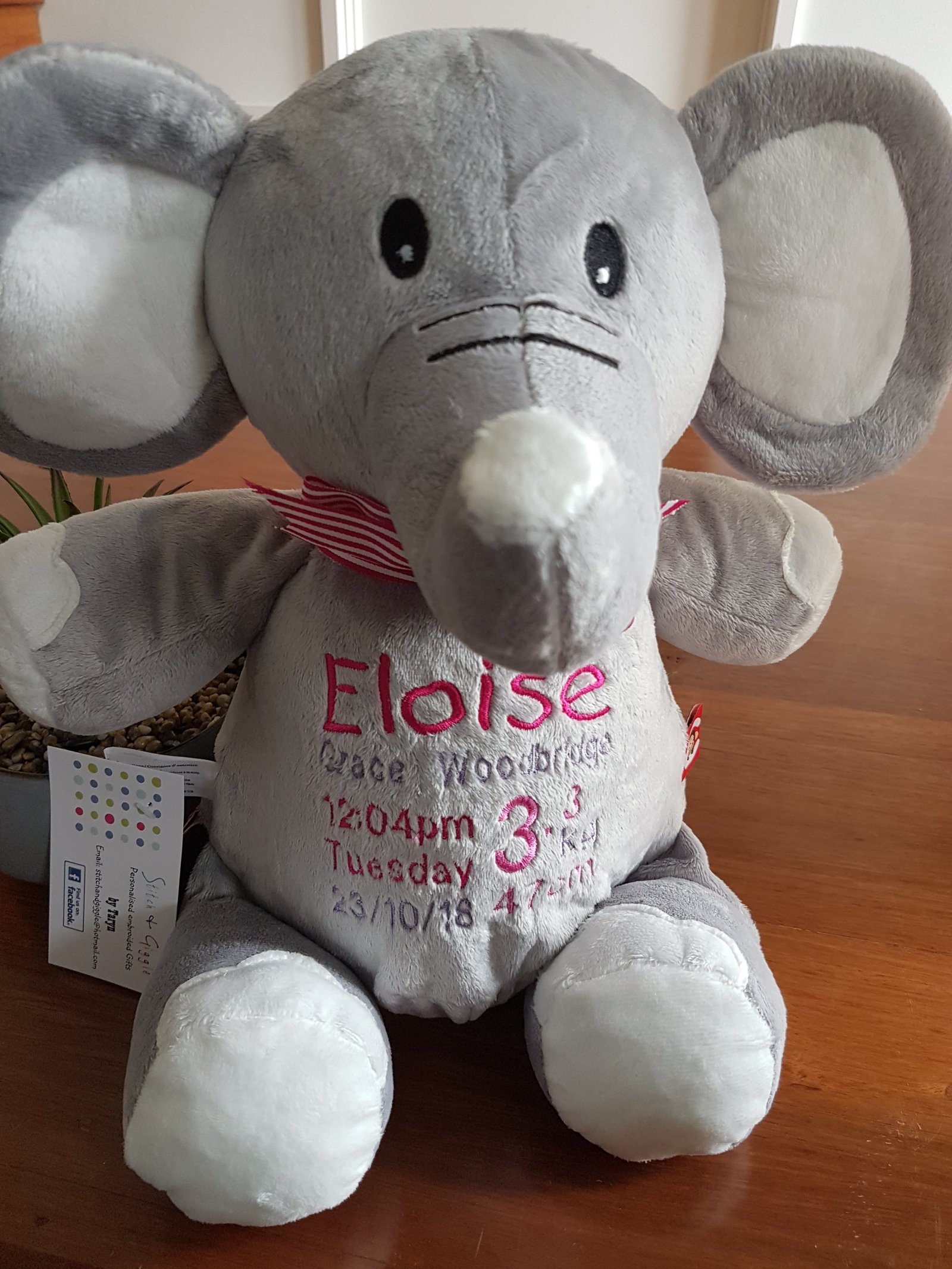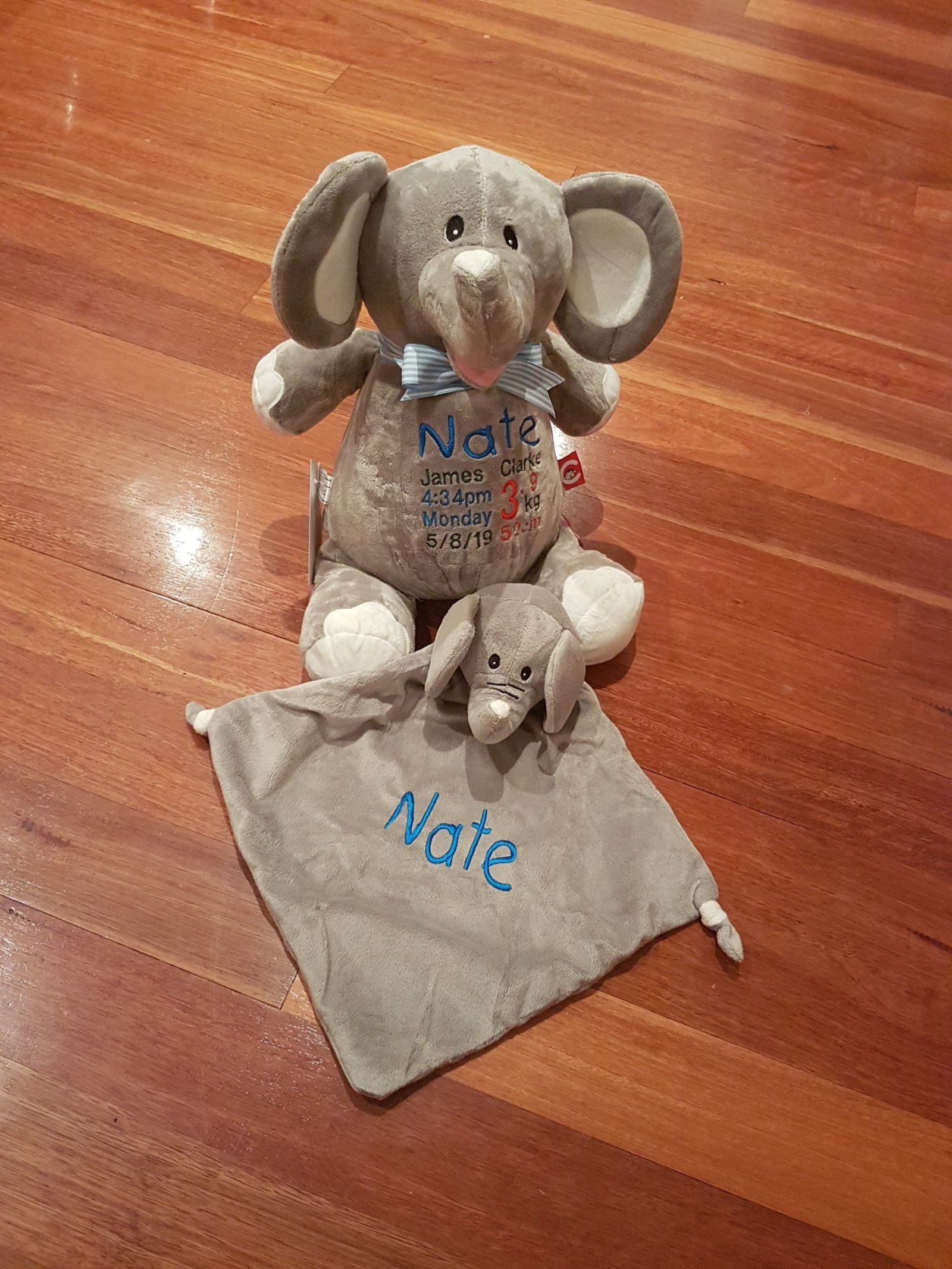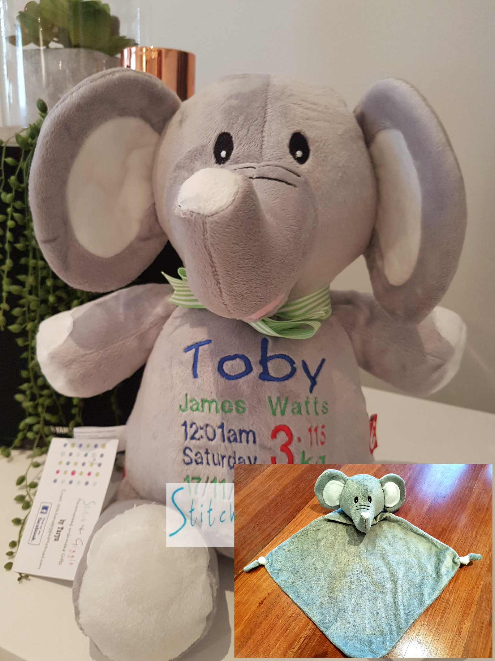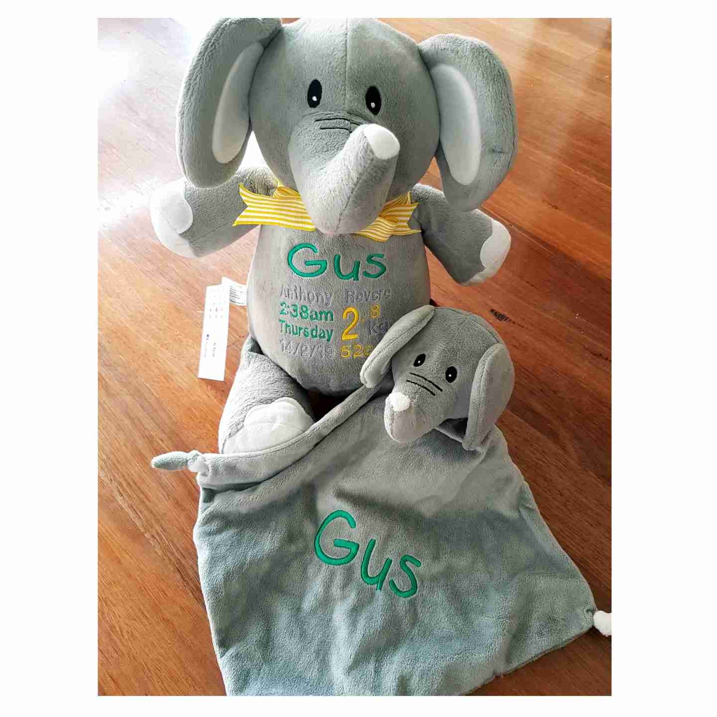 Elephant+ Security Blanket Combo– $85.00 (Includes full birth details or special occasion message to animal and single name to security blanket). Postage $12.