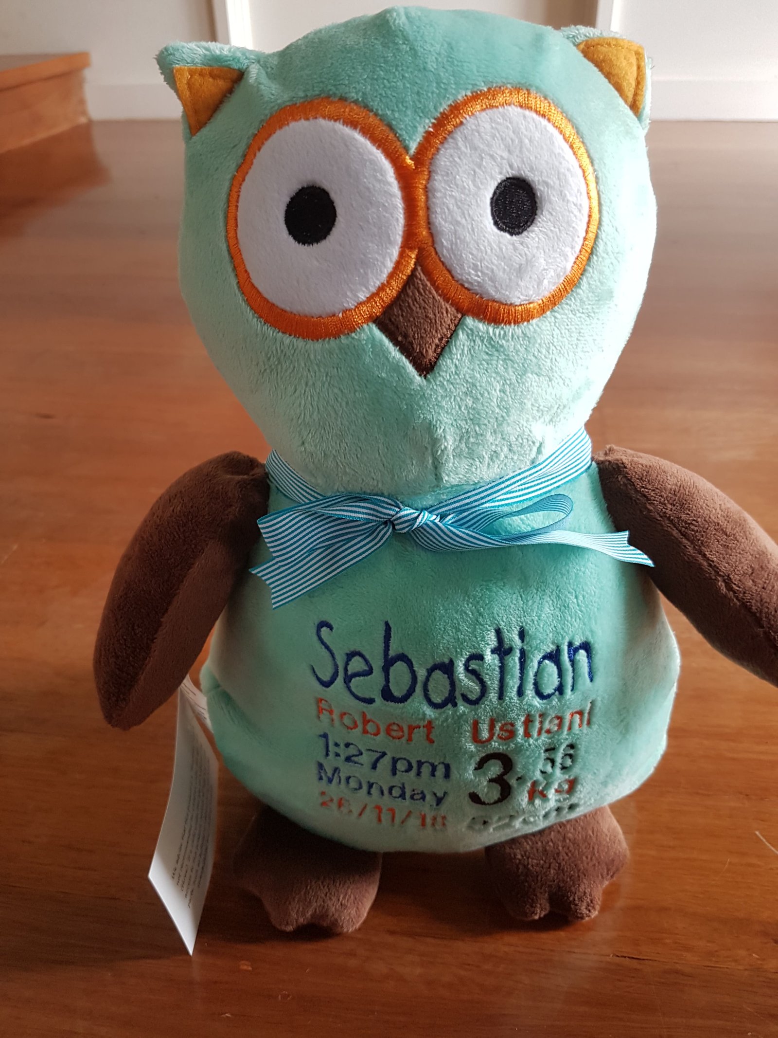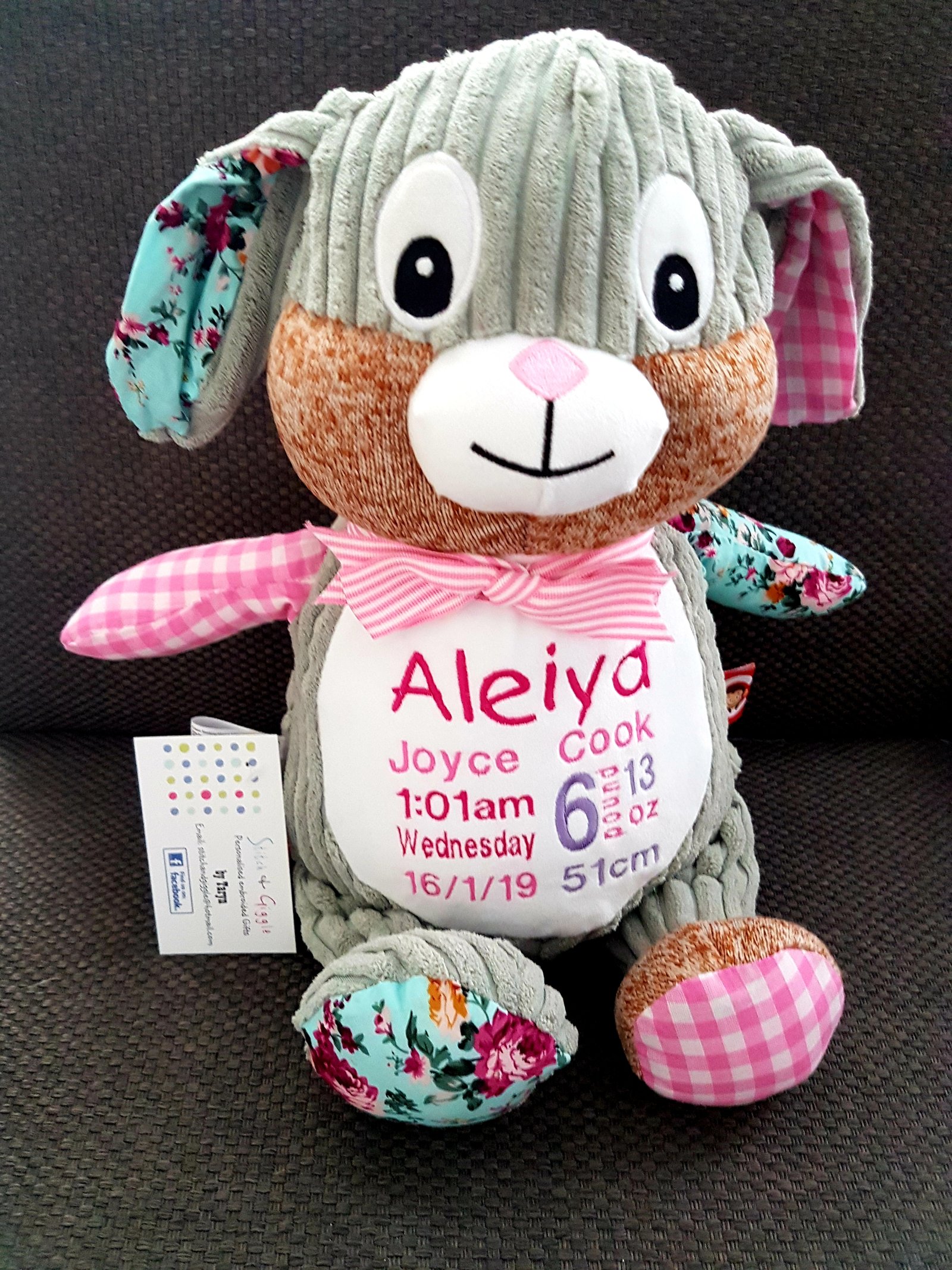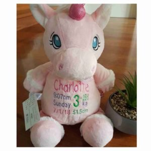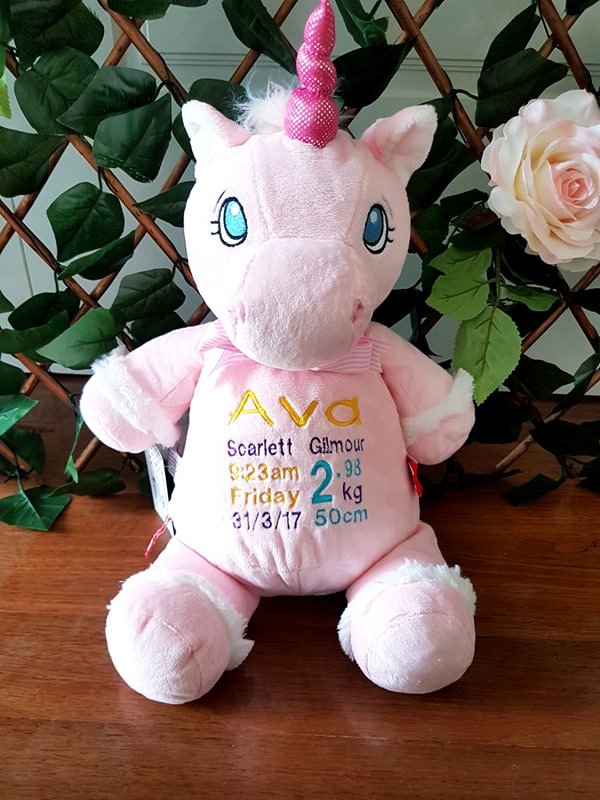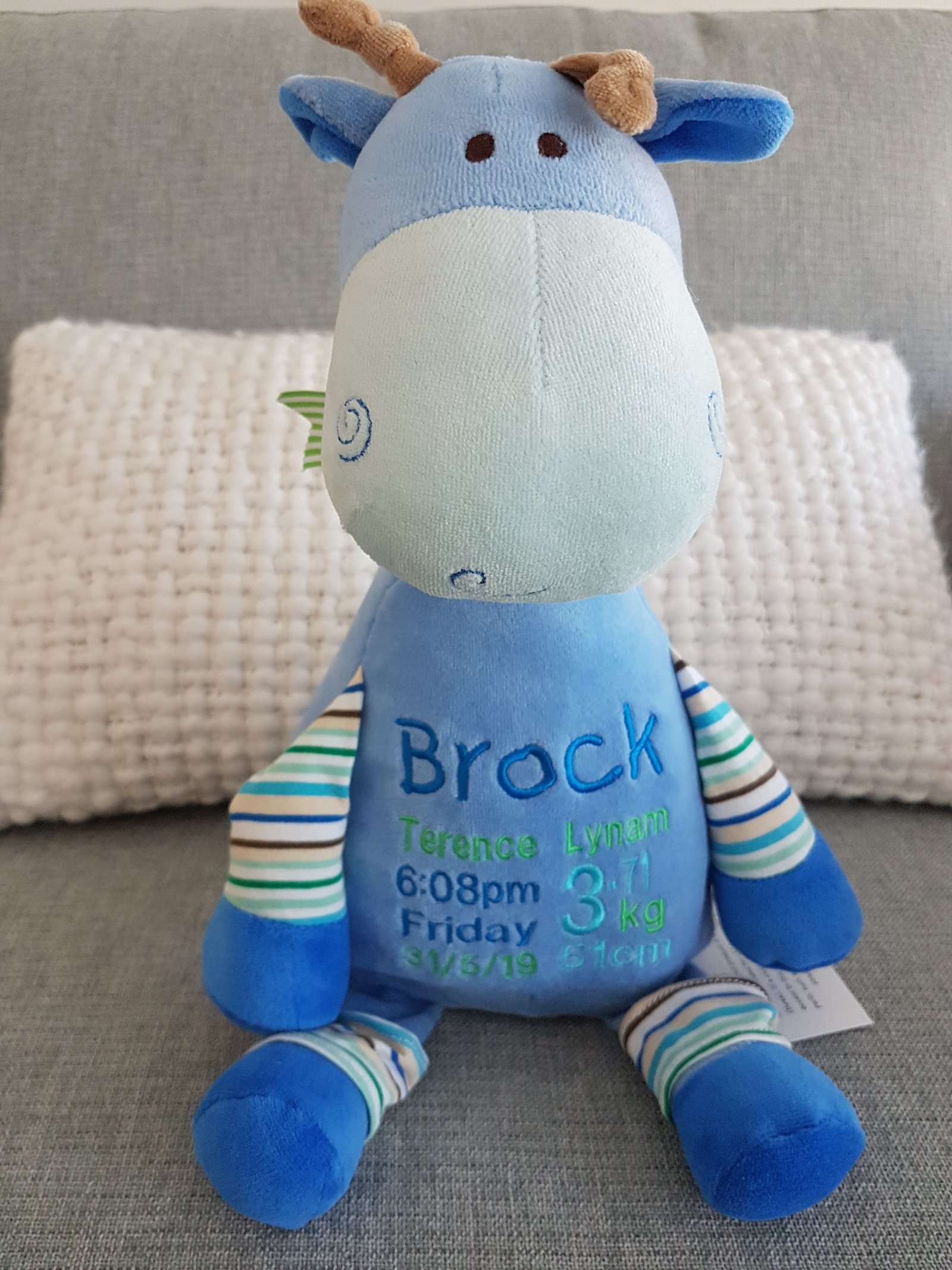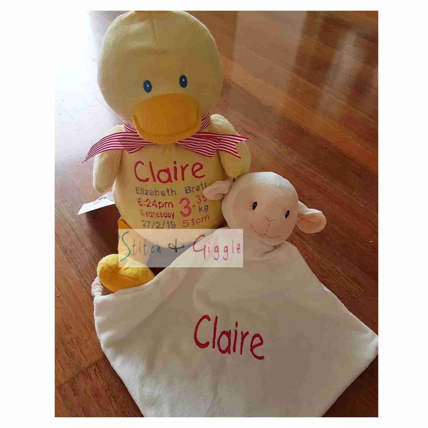 (Includes full birth details or special occasion message on animal and single name on security blanket. Postage $12.