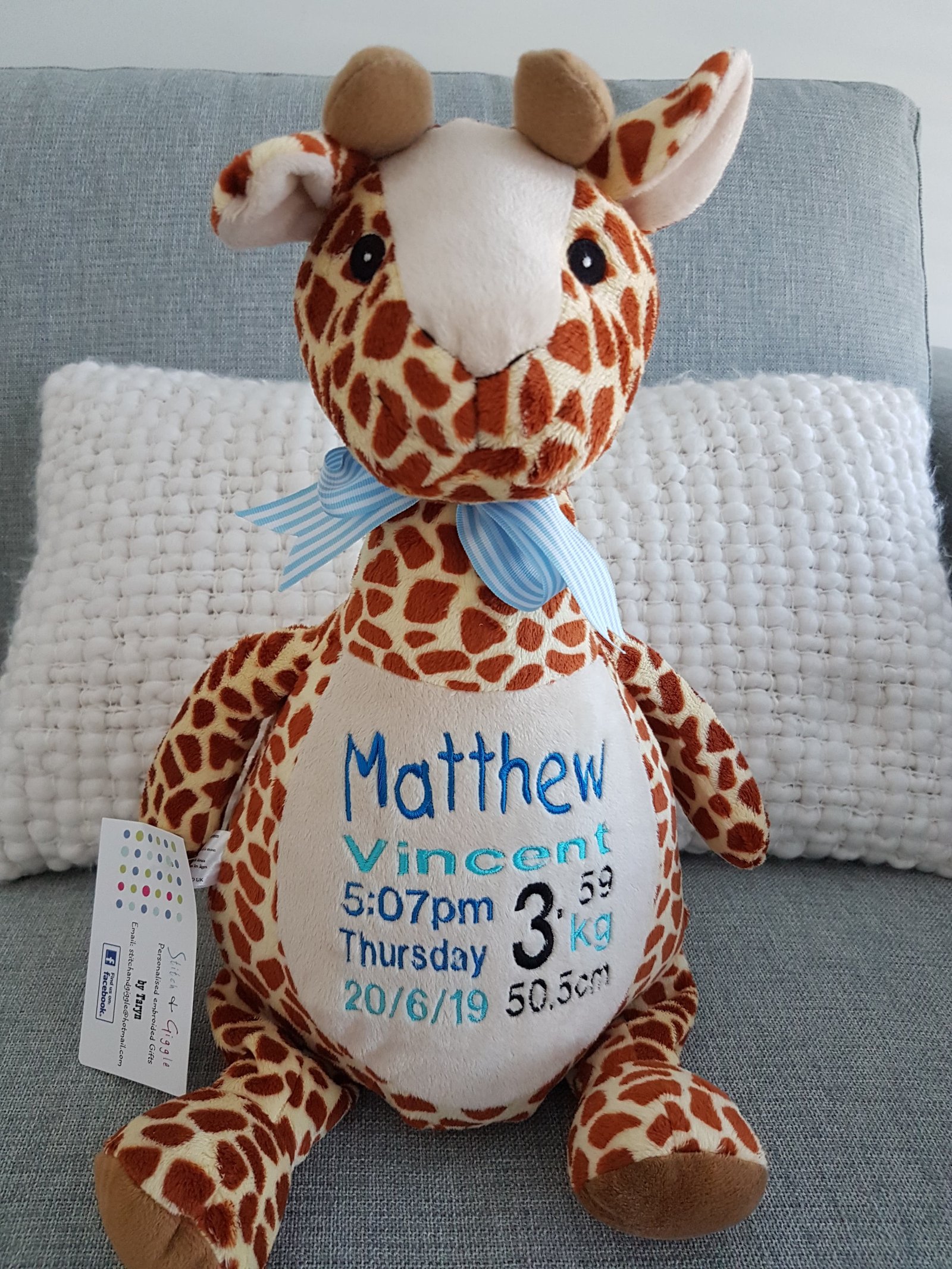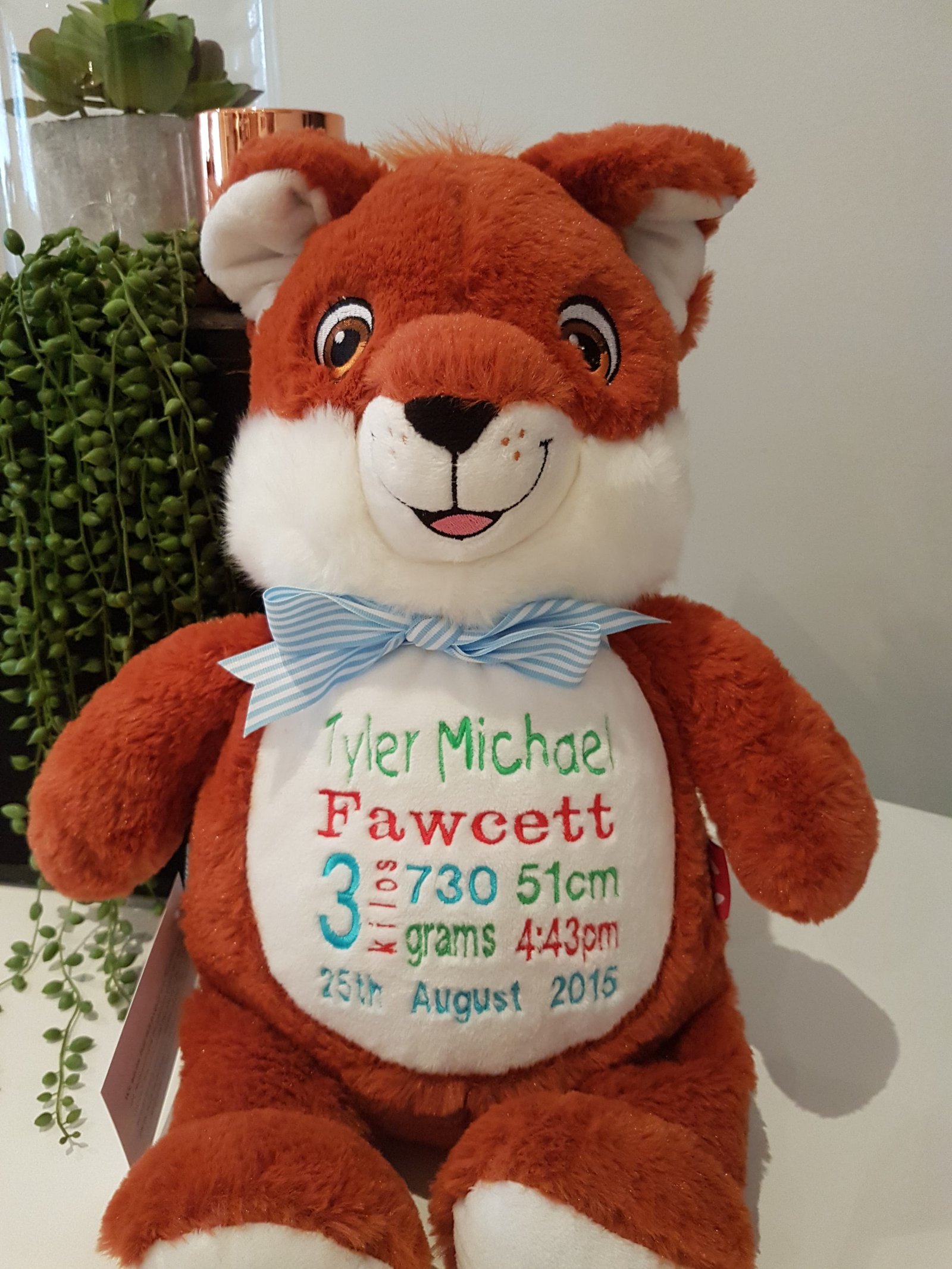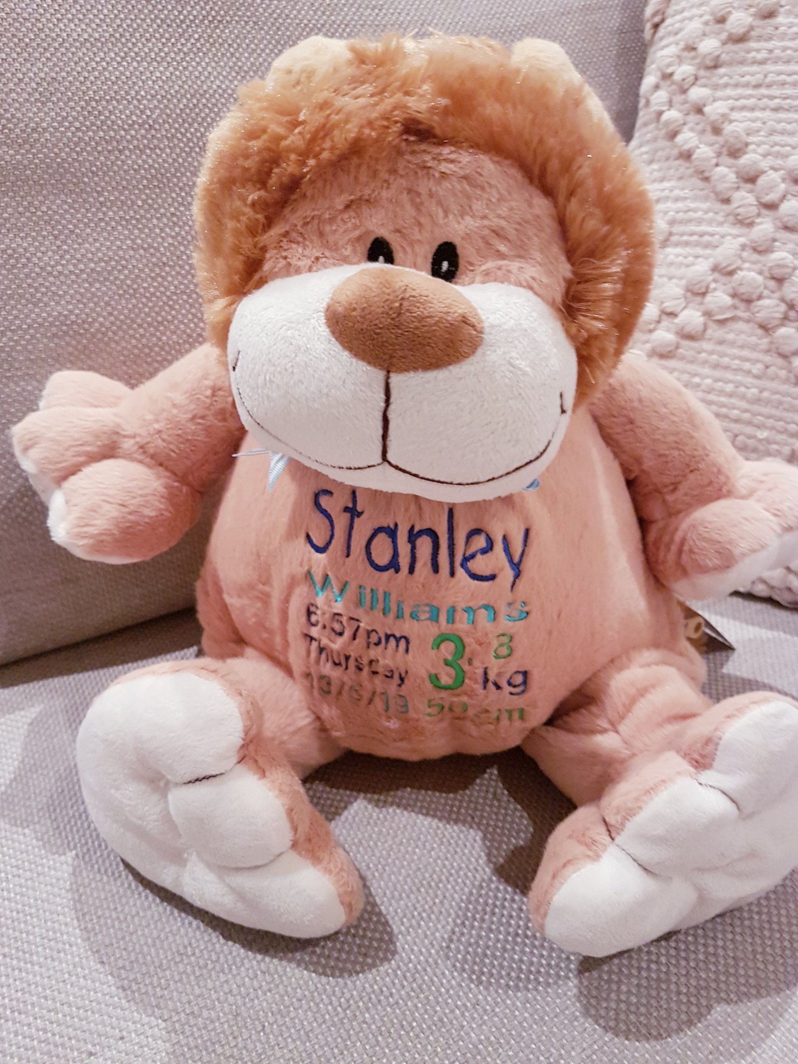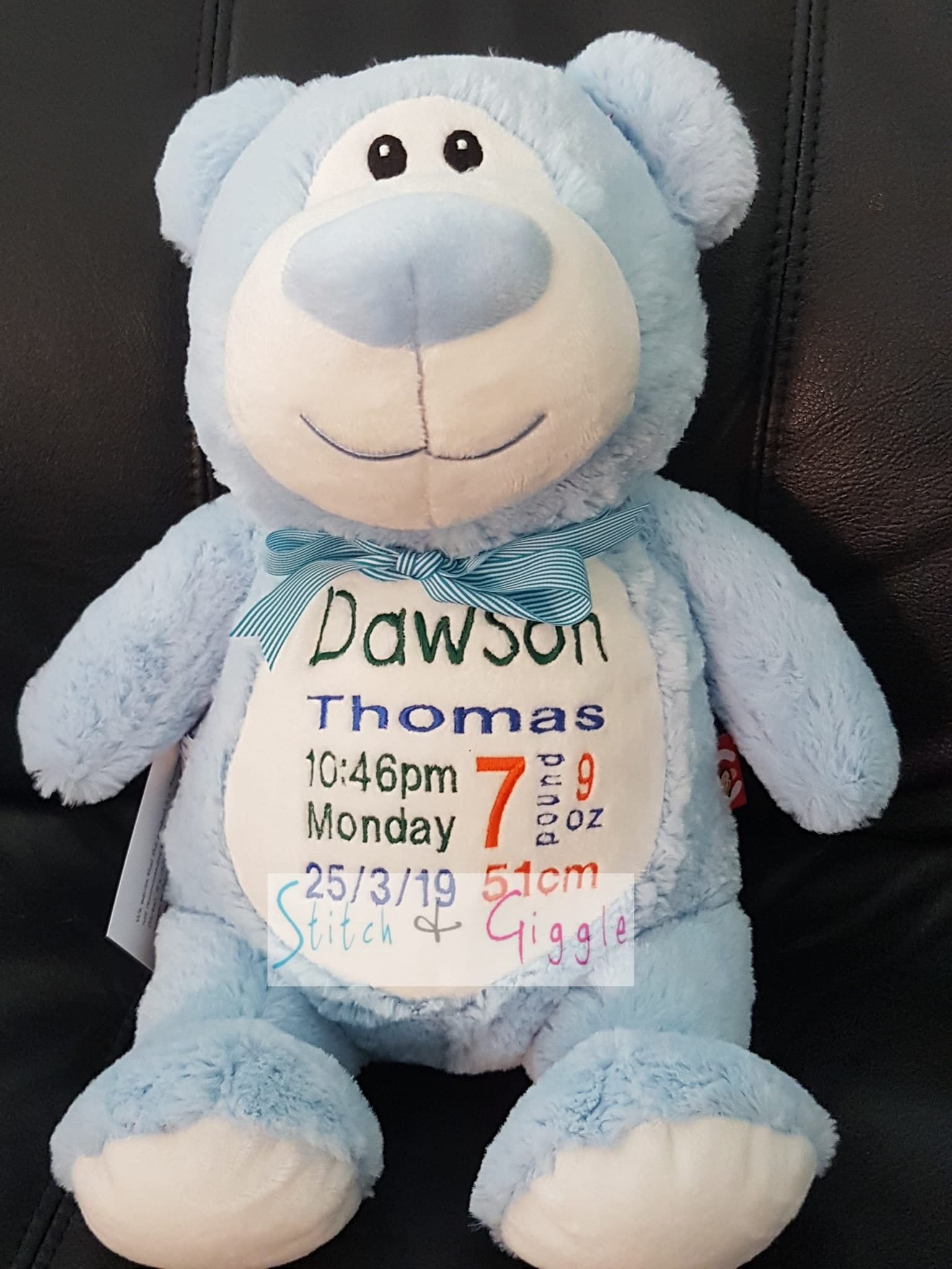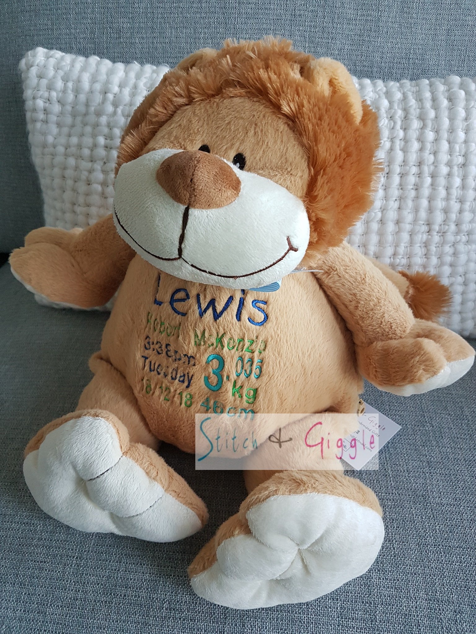 (Includes full birth details or special occasion message on animal and single name on security blanket. Postage $12.