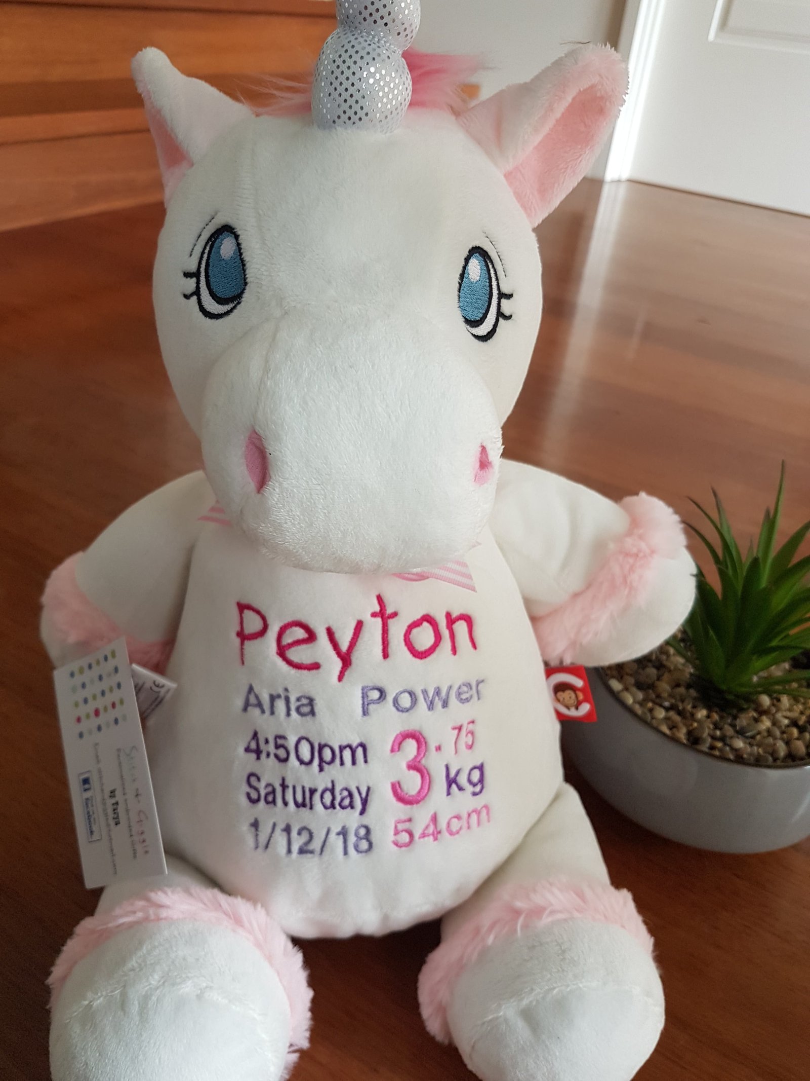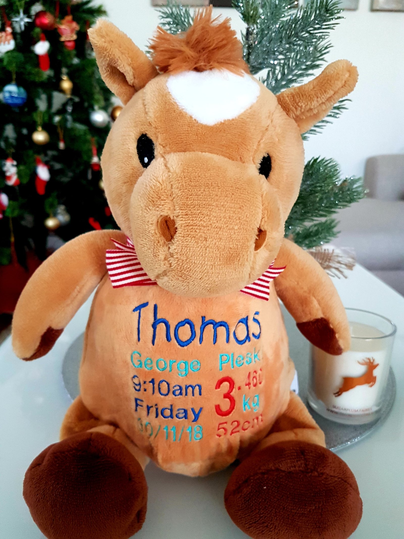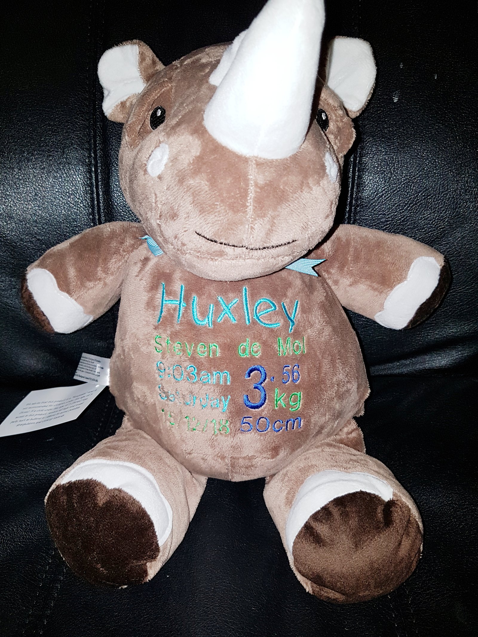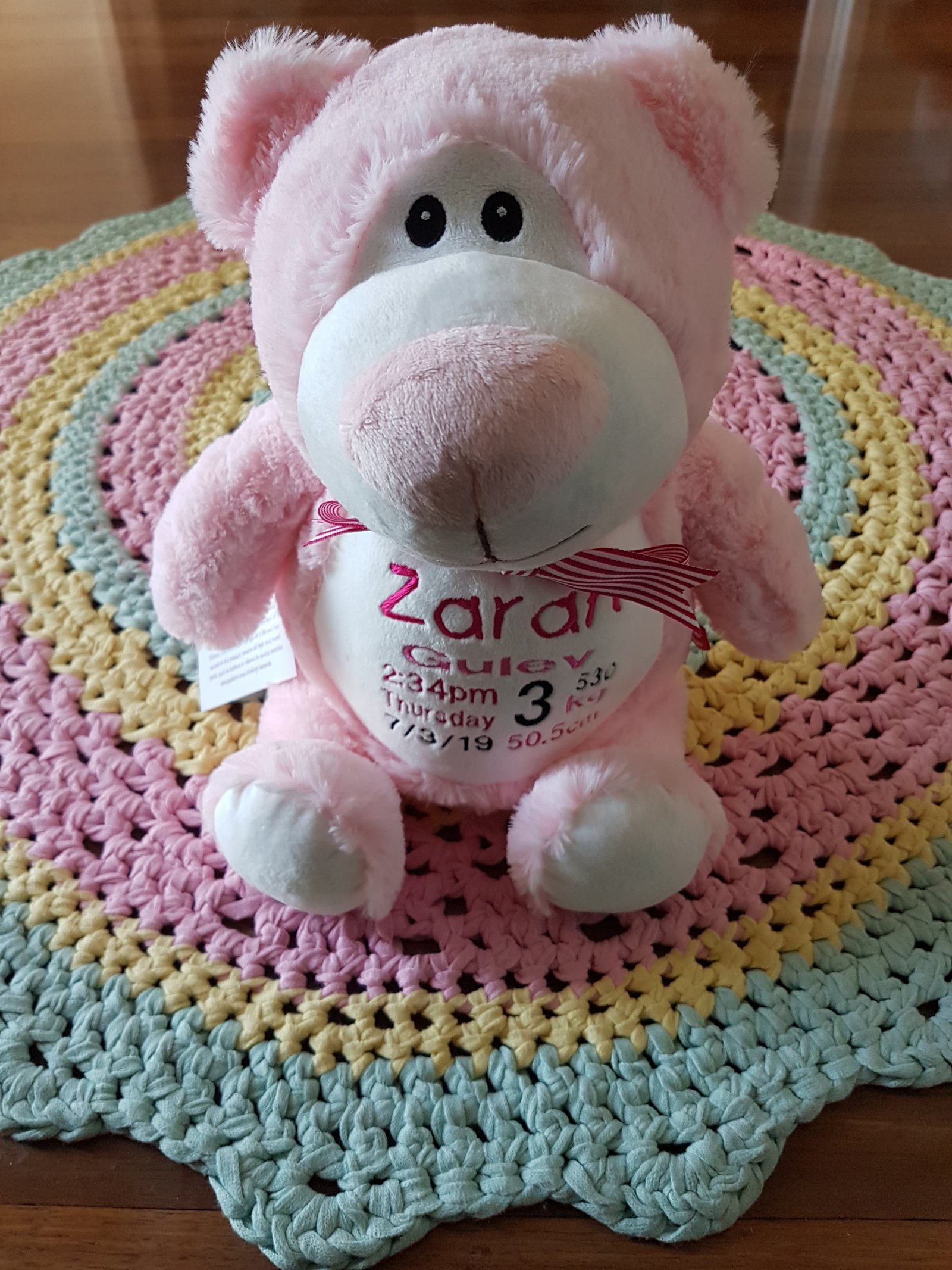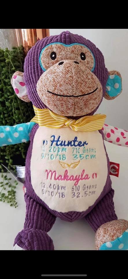(Includes full birth details or special occasion message on animal and single name on security blanket. Postage $12.