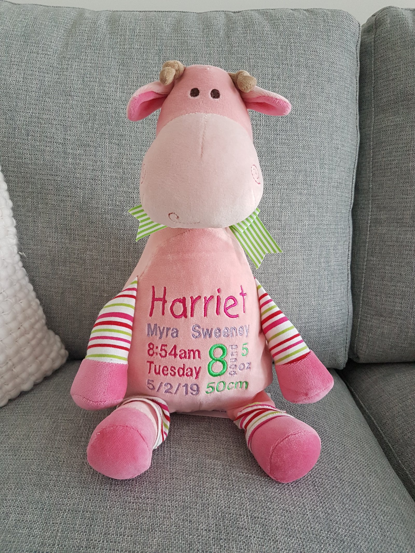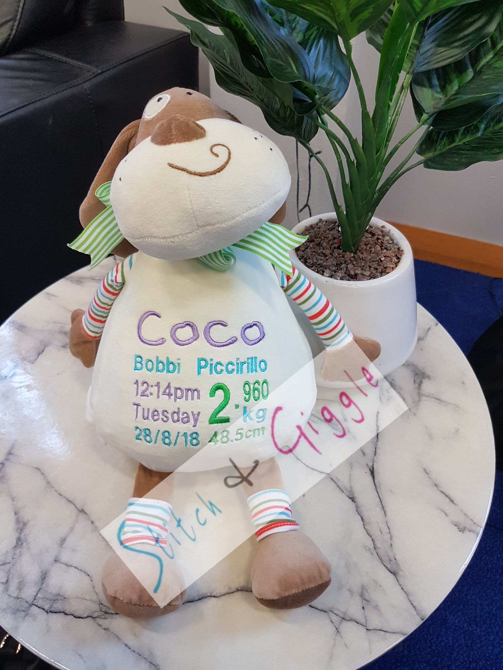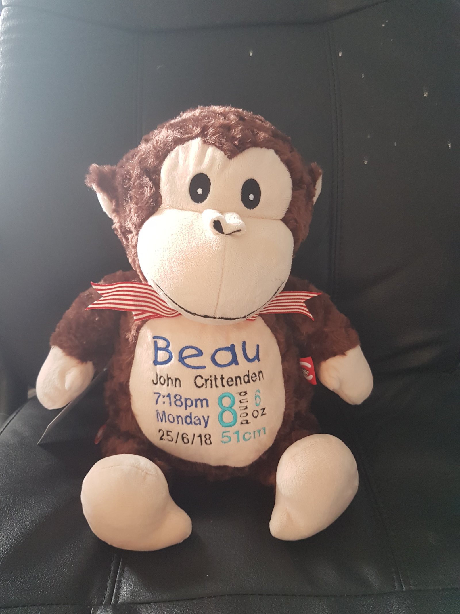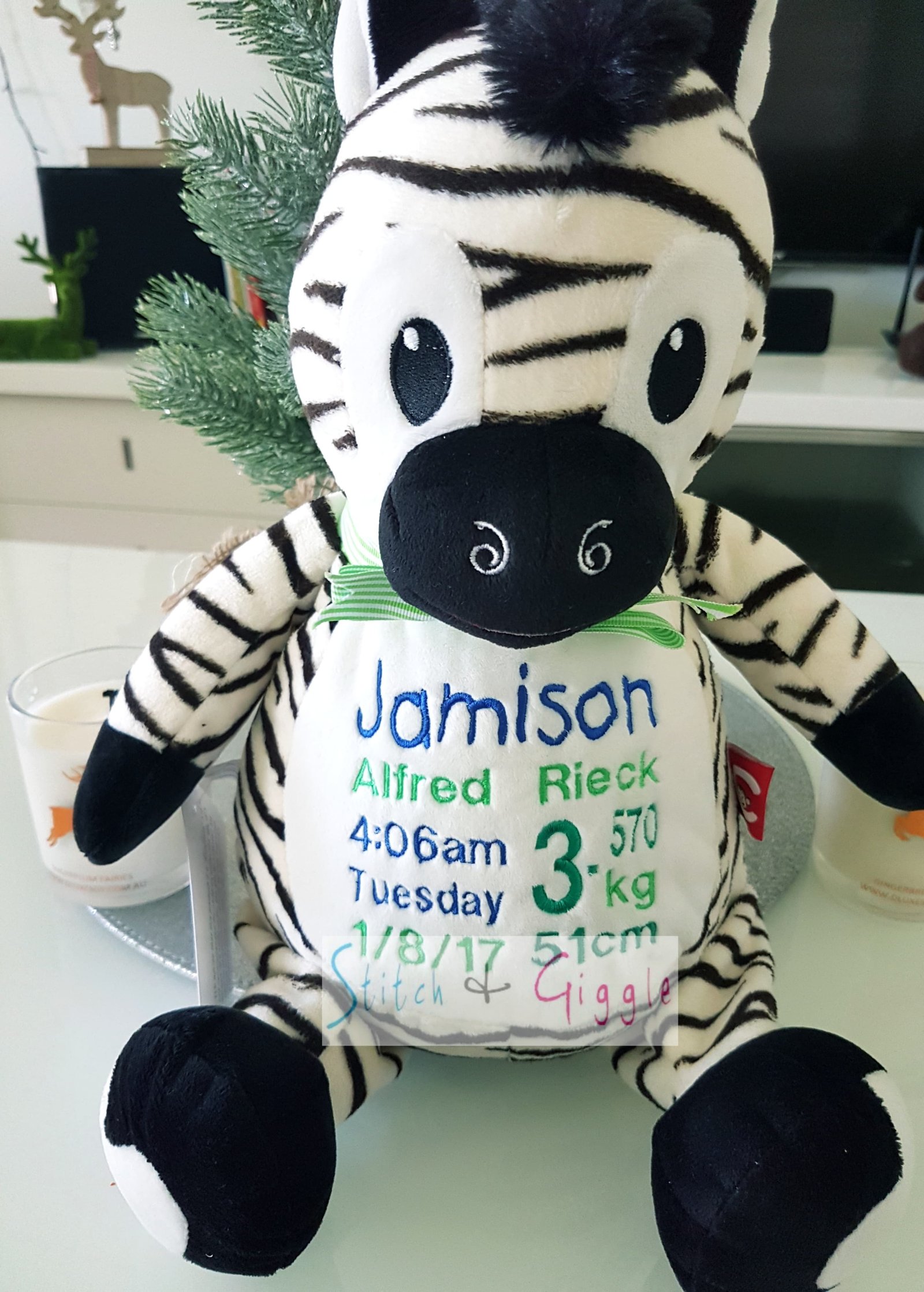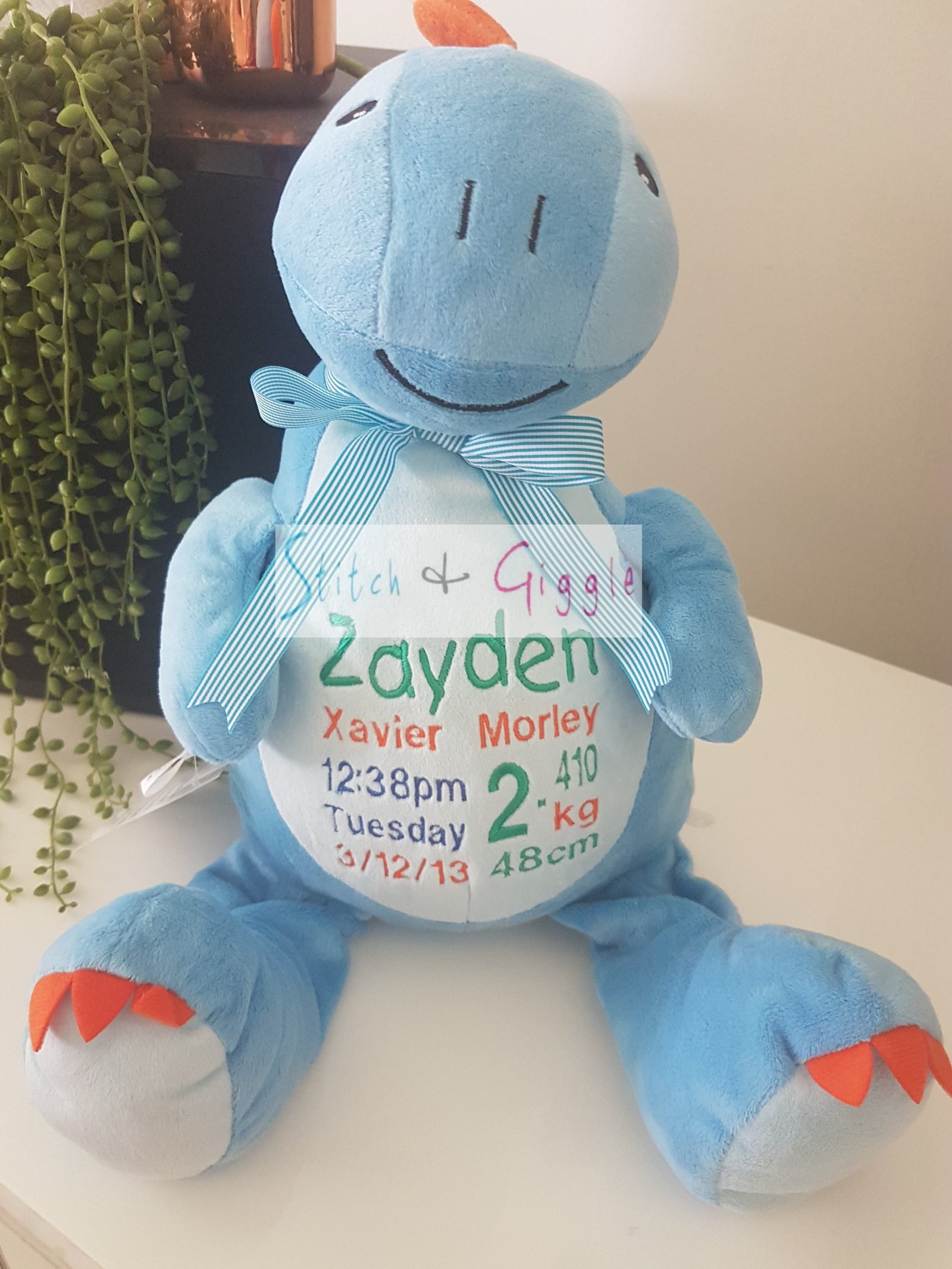 (Includes full birth details or special occasion message on animal and single name on security blanket. Postage $12.