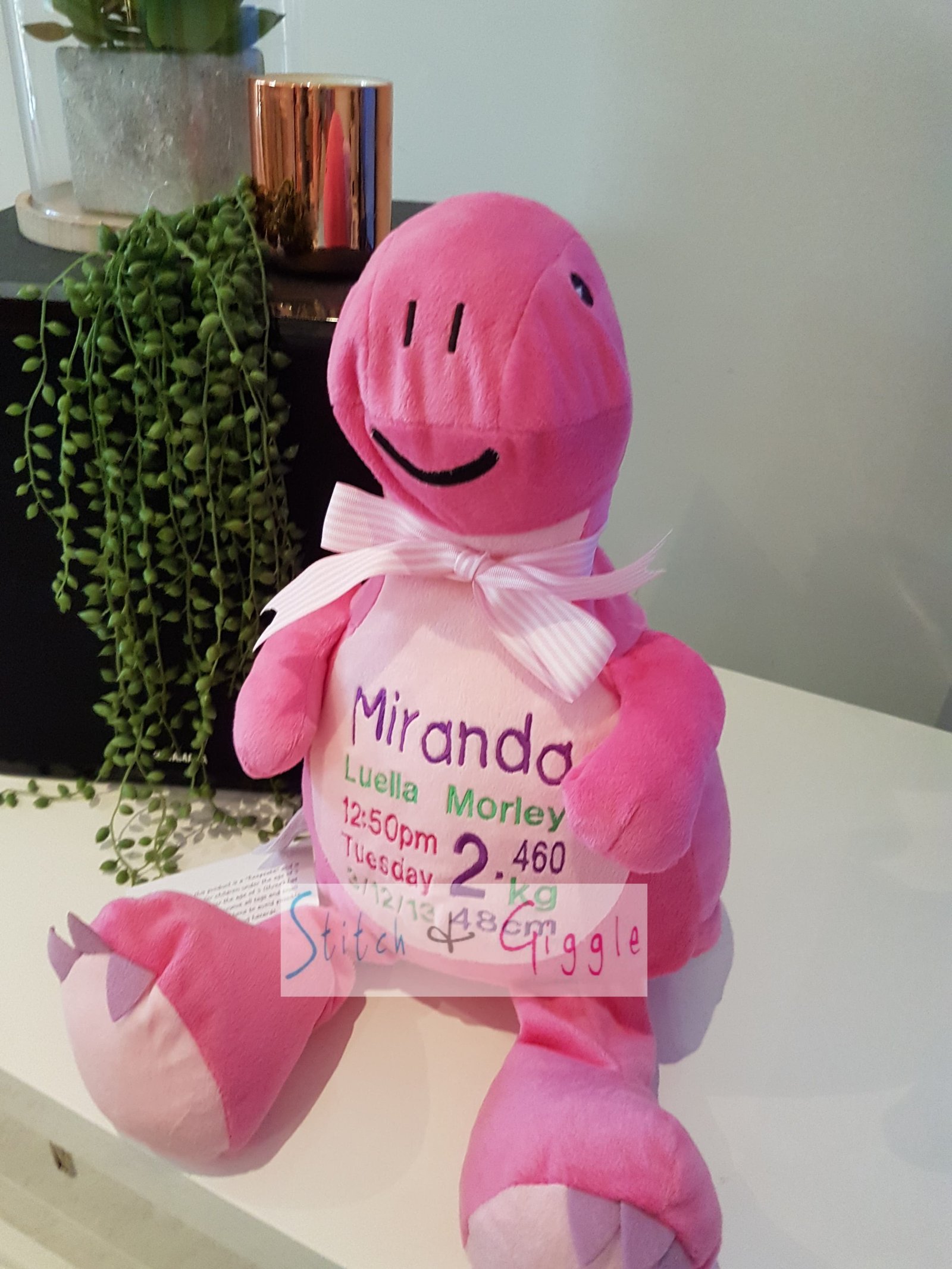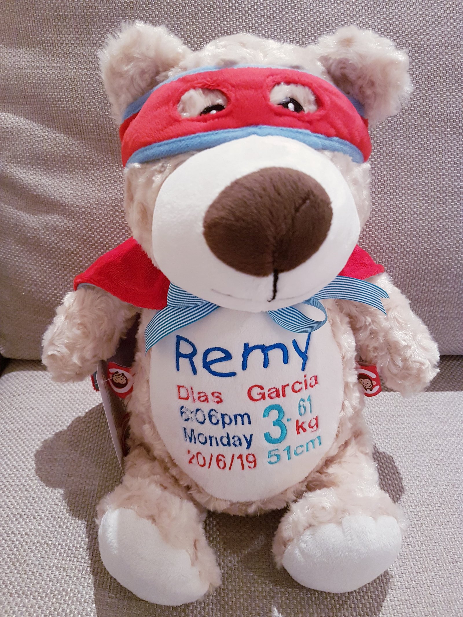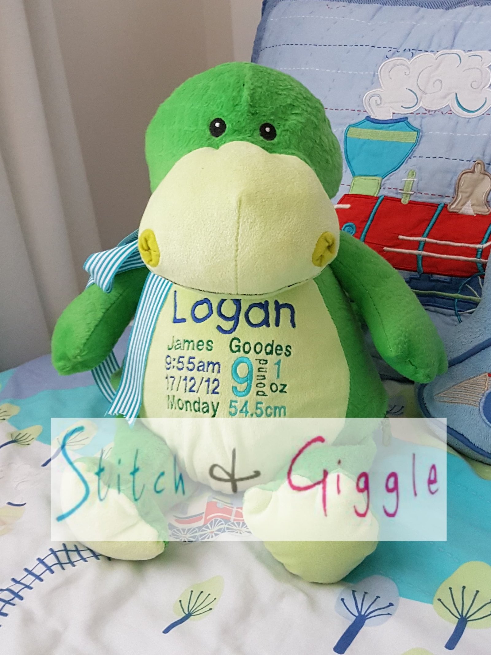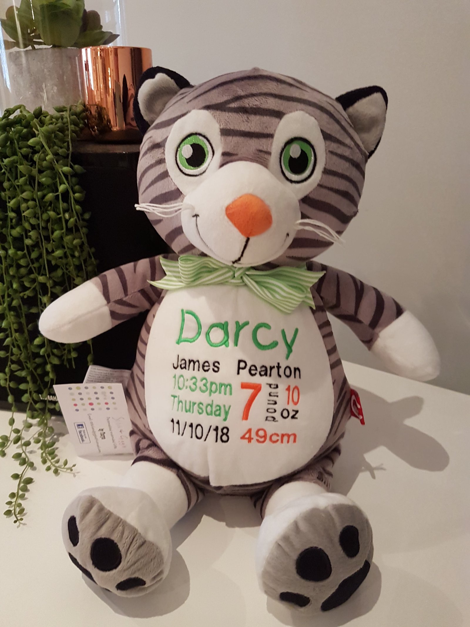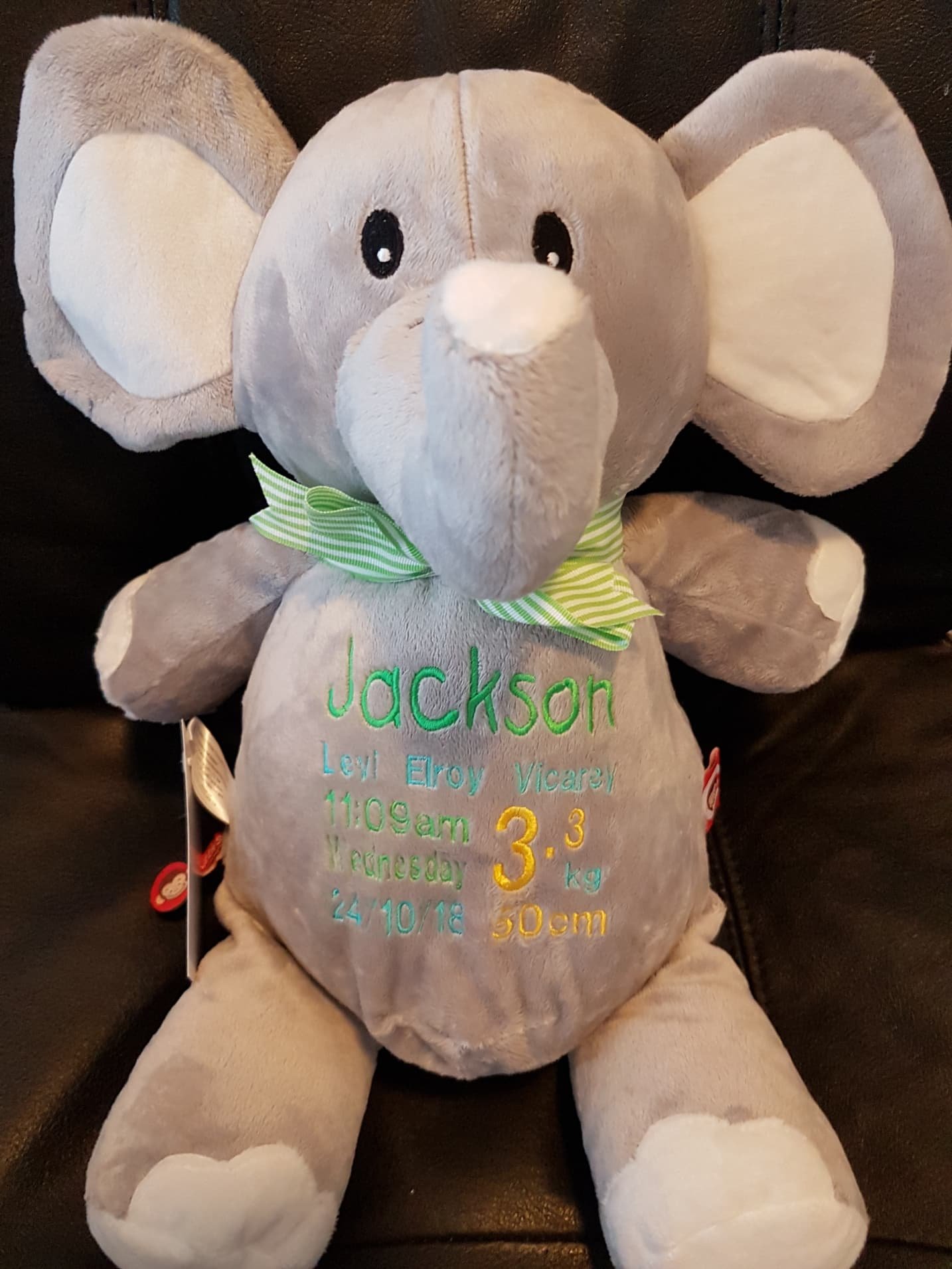 (Includes full birth details or special occasion message on animal and single name on security blanket. Postage $12.