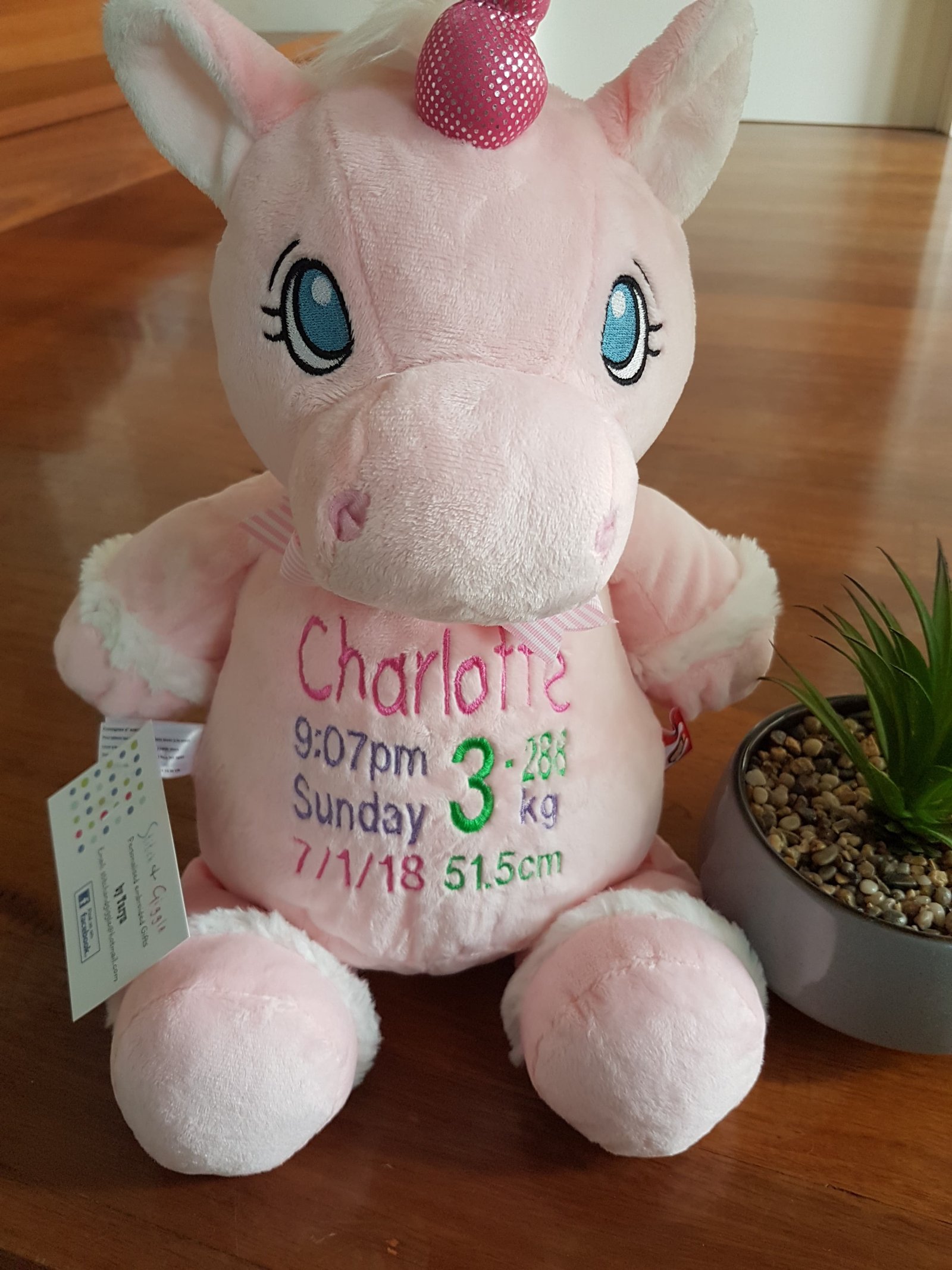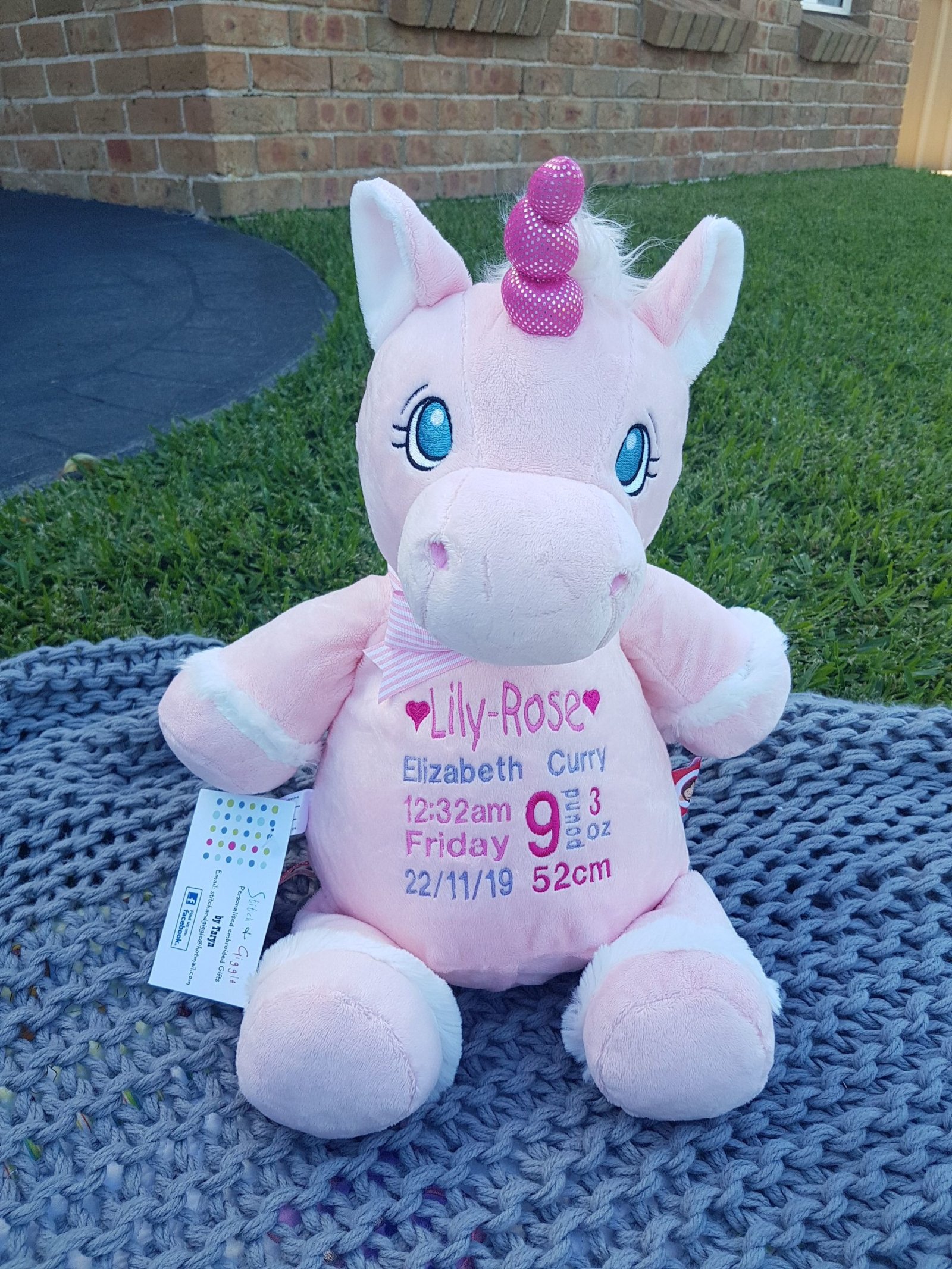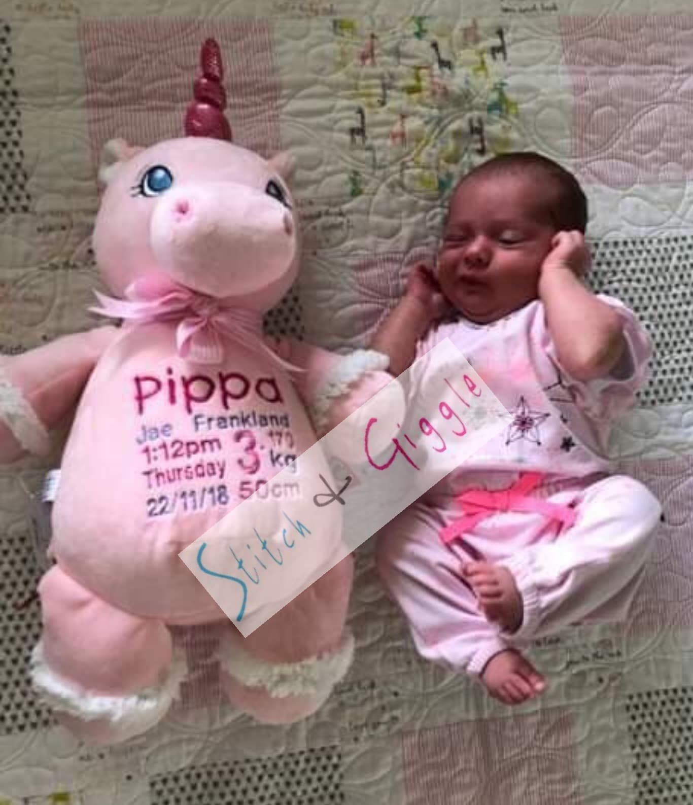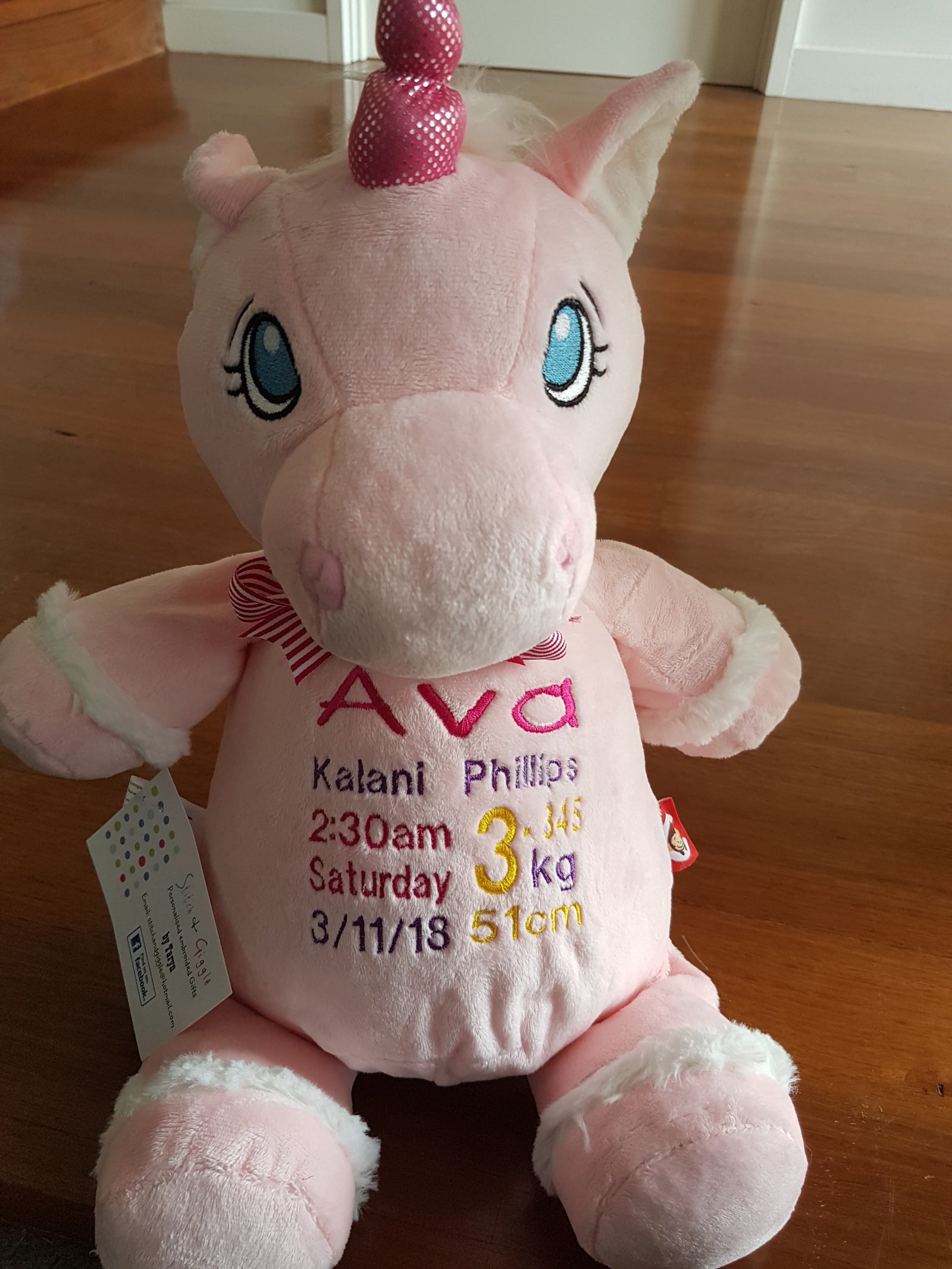 Pink Unicorn-$65.00 (includes full birth details embroidery or personalised message).