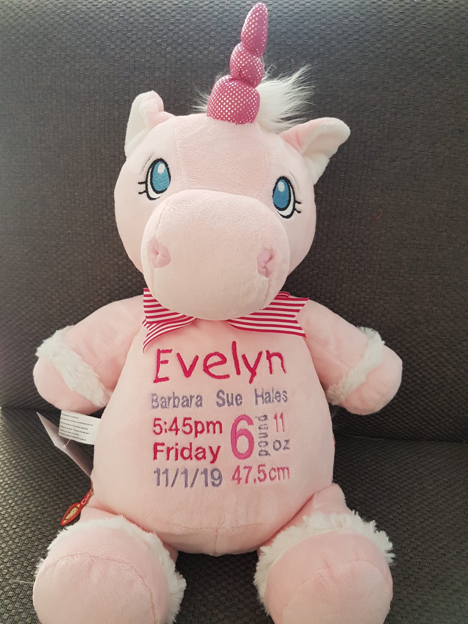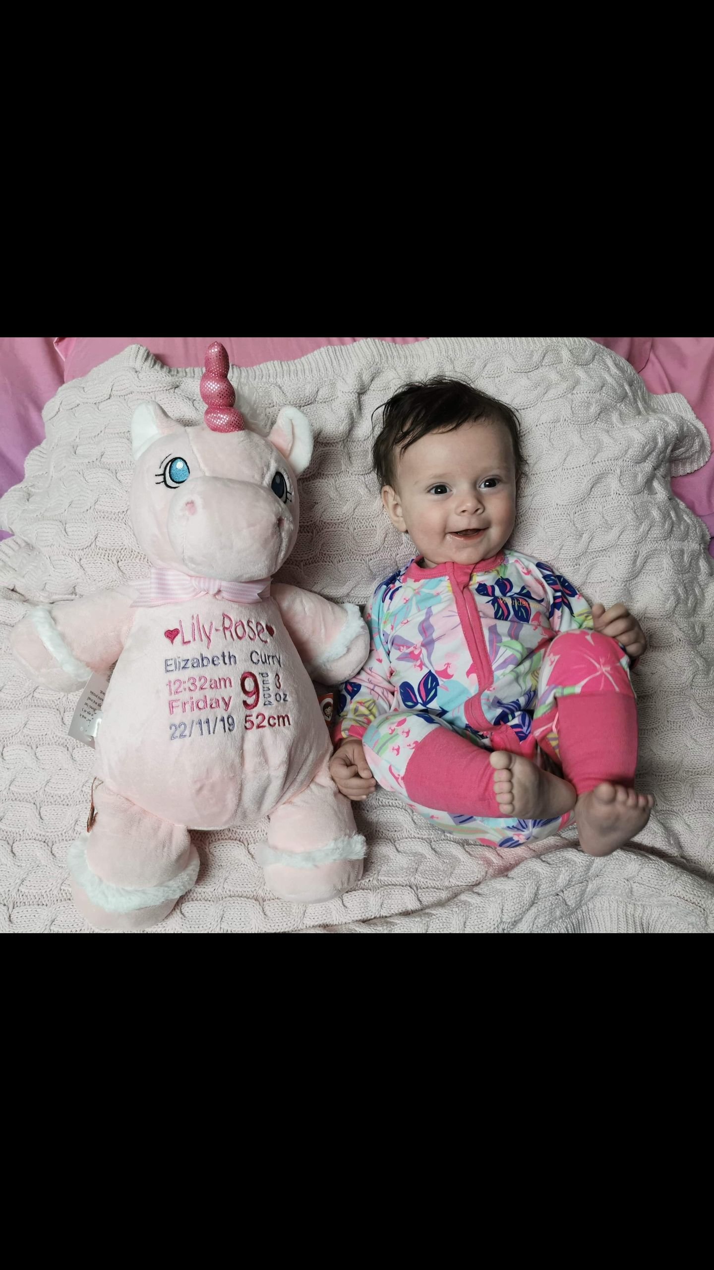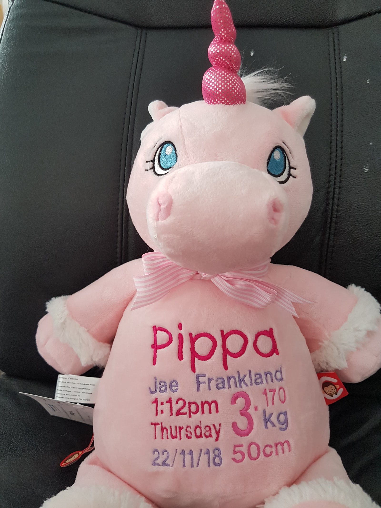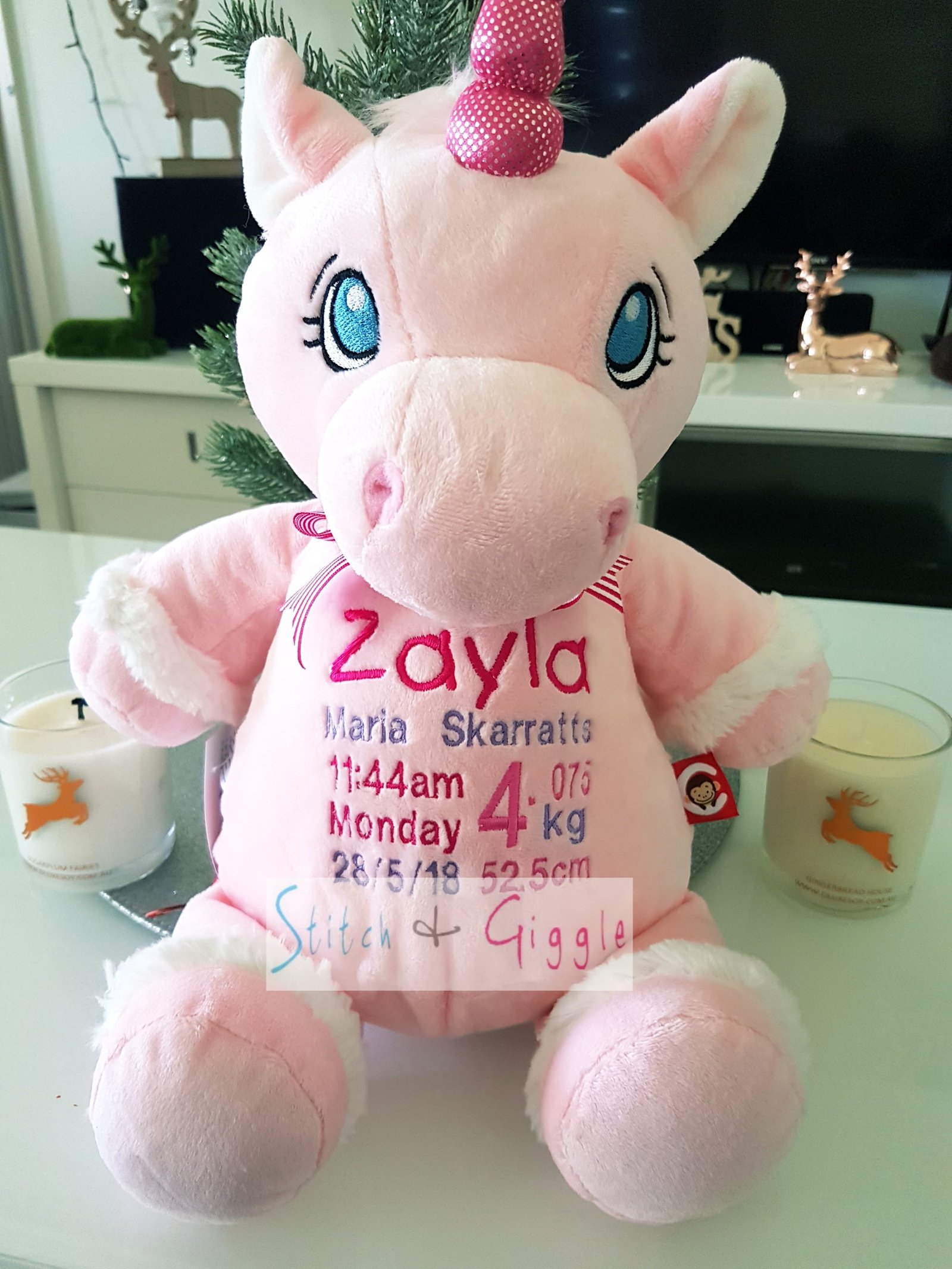 Pink Unicorn-$65.00 (includes full birth details embroidery or personalised message).
